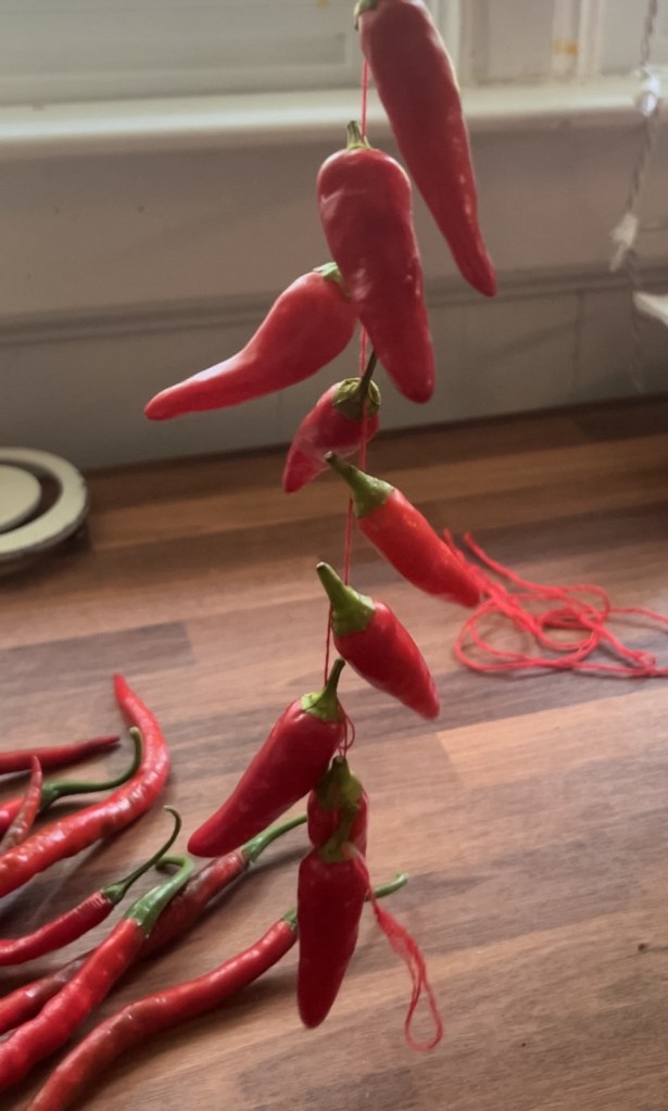 This year, I tried drying peppers for the first time and true to form, I stitched together a ristra using what I had on hand: red embroidery floss, a sharp needle, and a handful of cayenne and garden peppers. Traditionally, ristras are made with twine and knotted between each pepper. I didn’t do that this time, but I might next round.