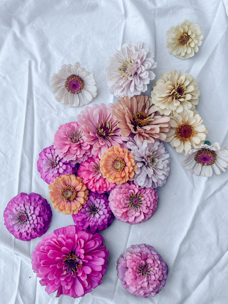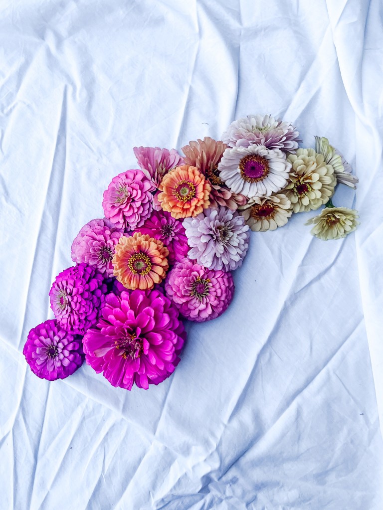I’d already removed the stems, so I started playing with a flat lay arrangement. At first, it was just about not wasting the flowers. But as I began placing them on the sheet, watching the light catch their edges, something in me softened.